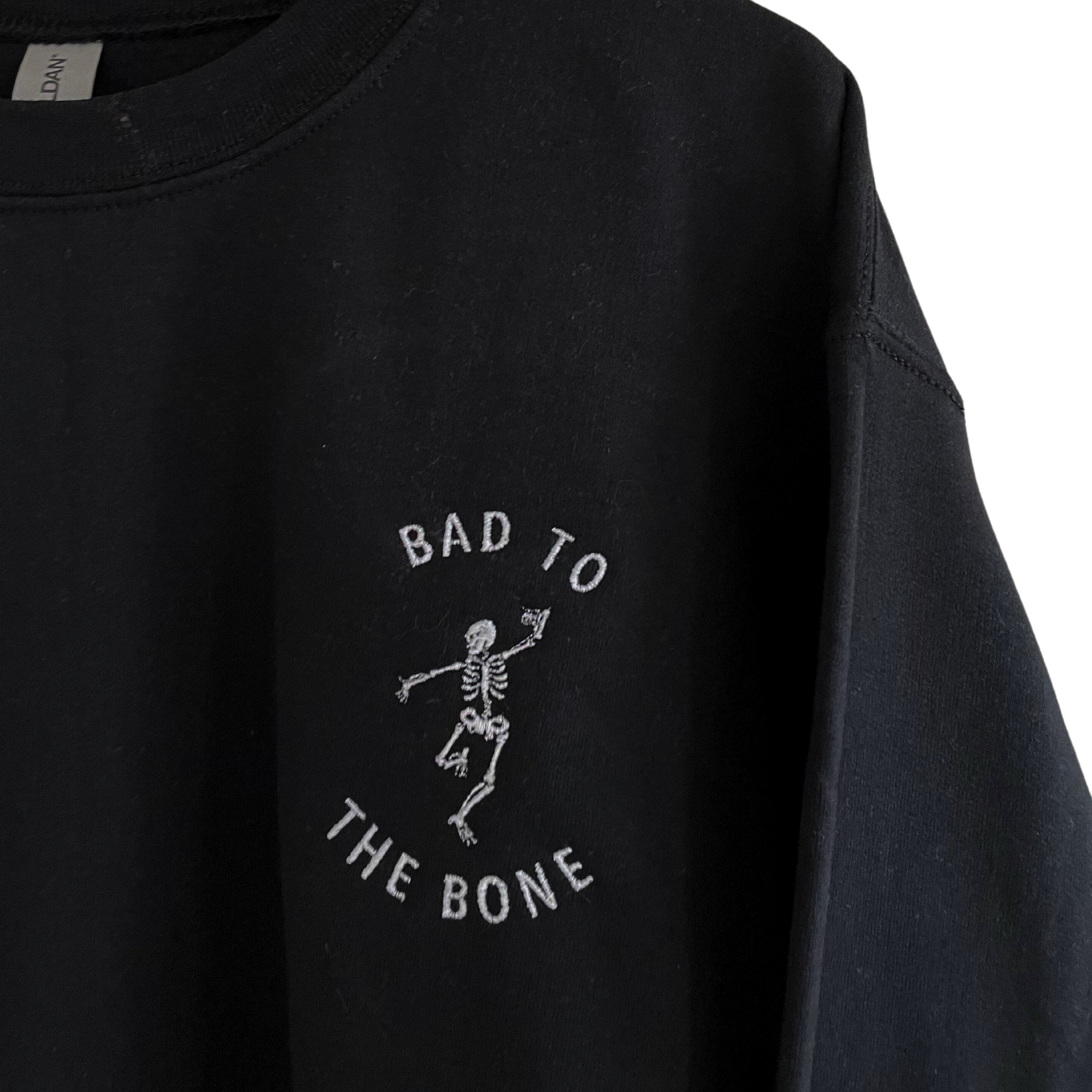 The most darling embroidered sweatshirts for fall. Multiple designs available! This Bad to the Bone design is available in white with black stitching or black with white stitching.