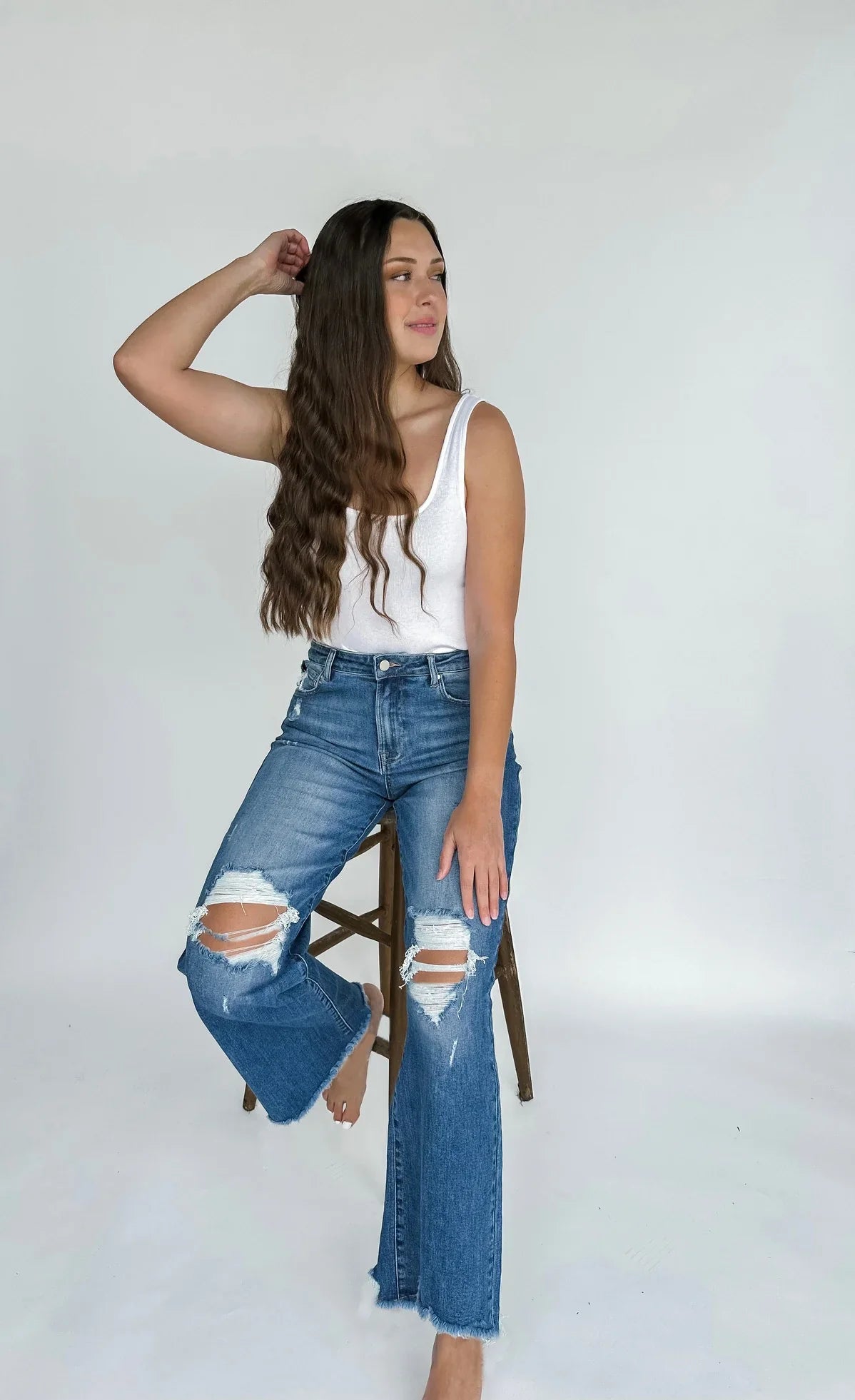 - FIT: High rise distressed, wide leg, very stretchy jean